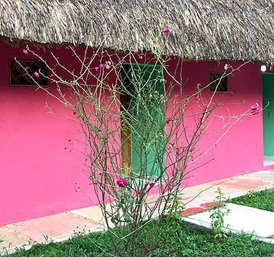 The remains of a rose bush in front of our cabin, after the ants had directed a trail into the village of Frontera Corozal, starting point for boat trips to the ruins of Yaxchilán. Children on the way to the river there preferred to walk on the Atta trails instead of going through the lawn or leaf litter. They were barefooted, and went swimming in the Usumacinto in spite of crocodiles living there (they were said to feast on tourists only ...).