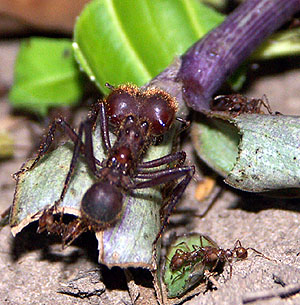 It was on 3/14/2004 at Frontera Corozal, in the strip of forest above the boats. Having seen a couple of majors engaged in removing obstacles from the trail, I wondered whether there would be a special recruitment of soldiers to a really hard and big obstacle. I chose a place some 10 m from the nest. Within 10 min I counted six soldiers coming from, and two running towards the nest. They ran with higher speed than all other workers, cutters and carriers.