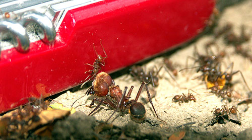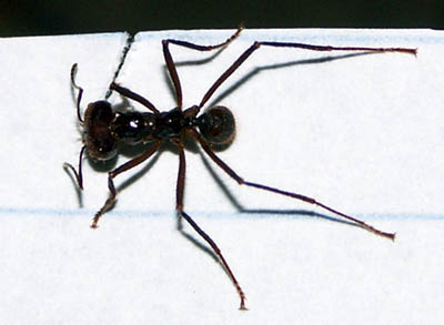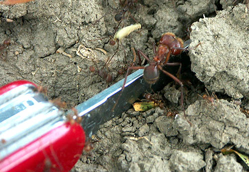 It was evening, quickly growing dark, and a sudden heavy rainfall stopped my activities. So I could not see what happened later. The next morning the paper had disappeared (though perhaps one of the children who watched us during all the experiments may have taken it away), and the trail was perfectly smooth and free of any obstacles. Of coures, these few experiments are everything else but a scientific study, but I got the impression that the so-called soldiers (or majors) have a particular function in removing strong and heavy obstacles from the trail, at least in addition to their defensive function.