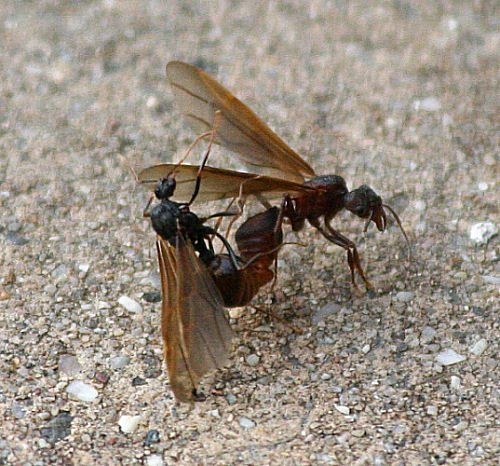 This web site indicates that "after the female Acromyrmex versicolor falls to the ground, lots of males attempt to mate with her." However, K. observed that in most cases the ones that were raining down were already coupled.