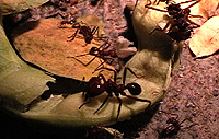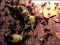 NOT AVAILABLE ANYMORE. SORRY! If you are interested in leafcutter ants, or simply ants in general, then you might be interested in this DVD, which is dedicated 100% to close-up scenes of the daily life of the leafcutter ant Atta mexicana. When I was taping these critters it was for research purposes, but I found out later I could splice together segments and make a DVD. The movie includes 46 minutes of footage of Atta mexicana leafcutter ants taken during our trip to Puerto Vallarta and Nuevo Vallarta in Mexico in November/December of 2003. The most spectacular part (at least for me) is nearly 20 minutes long, and features great scenes of the leafcutters foraging on large seeds and fruits. The images are pretty good, and this segment is the basis for a study on the behavioral plasticity of Atta soldiers. Some email comments by people who have seen the DVD: