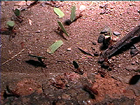 This segment at 18 minutes is the longest segment, but it is also the best in the film (at least to people like me who don't mind watching 18 minutes of ants foraging!), with all the footage being close-ups of the ants cutting into the seeds and pods, as well as heading back to the nest. The image to the left actually is not representative of how close-up most of the scenes are - I noticed camcorders can get much closer to small objects thasn digital cameras. |