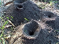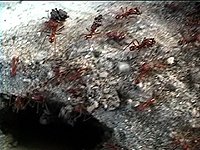 Nest Excavation | Extended version of ants clearing their mound. Some very nice closeup pics of swarms of workers with large pellets coming out of the nest hole and piling them to the sides. If you look closely, you might even see one worker picking up a dropped pellet and moving it further away. This phenomenon, called task patitioning, has been documented for leaf foraging, emigration (once), and waste removal, but never for mound clearing. | 3:39 min |