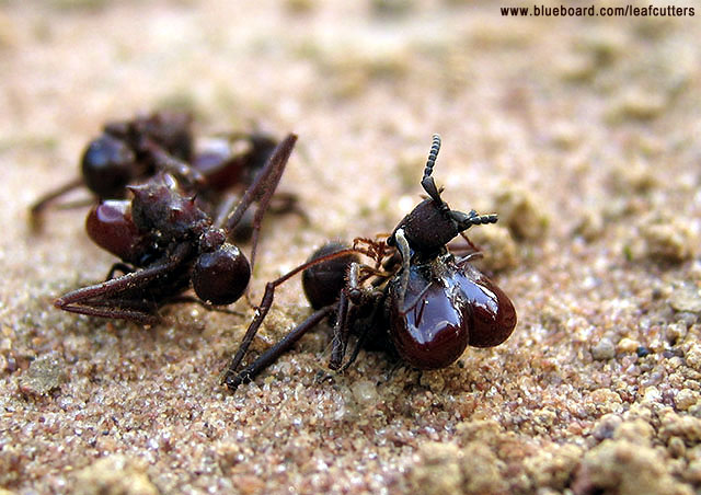 Powell, S. & Clark, E. 2004. Combat between large derived societies: A subterranean army ant established as a predator of mature leaf-cutting ant colonies. Insectes Sociaux, 51: 342-351.