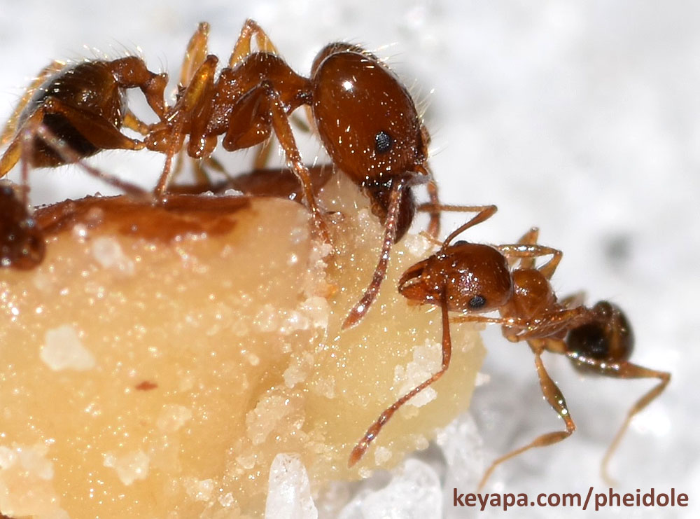 Unfortunately, I suddenly realized that there were two types of ants at the bait, and noticed at least one pair that was grappling in a tumbling ball as other ants gaster-flagged around them. It was Solenopsis fire ants, and before long the fire ants had cleared the area of the luckless Pheidole ants