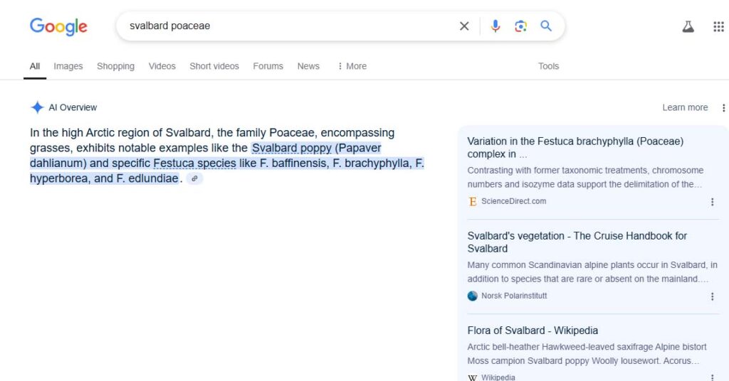 In this case, I had plugged in “svalbard poaceae” as the search term, and the overview had given the usual Festuca spp that is so prevalent in northern climes. But it also mentioned Papaver dahlianum, which I did not recognize, and when I actually searched for that term I found out it’s from the plant family Papaveraceae!