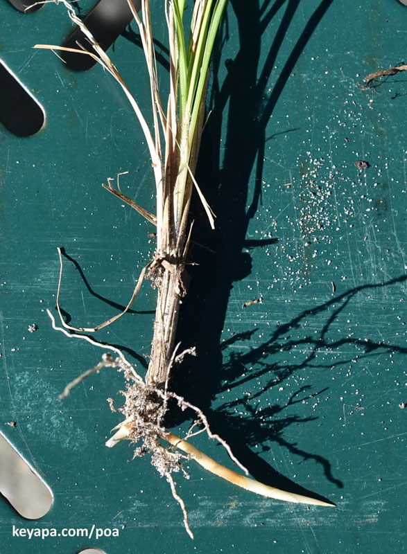 (4) Pull out one of the culms and check for whitish, scaly, very sharp rhizomes mixed in among the fibrous roots. Cogongrass has an extensive system of underground roots and rhizomes.