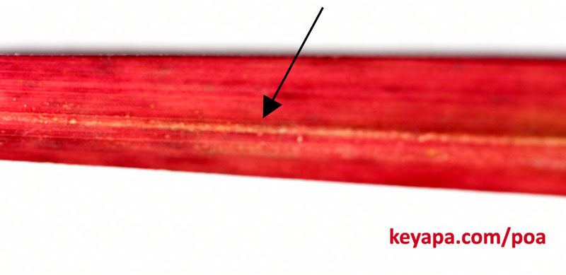 whitish mid-rib close to the tip. That is, the whitish rib will not be running right in the center, but will be slightly closer to one edge. If you run your finger down the edge of the blades you will feel sharp edges.