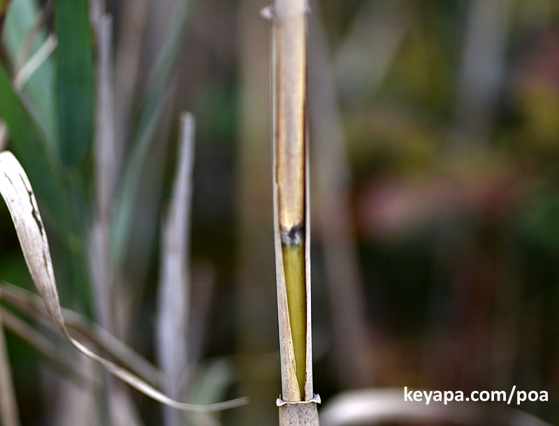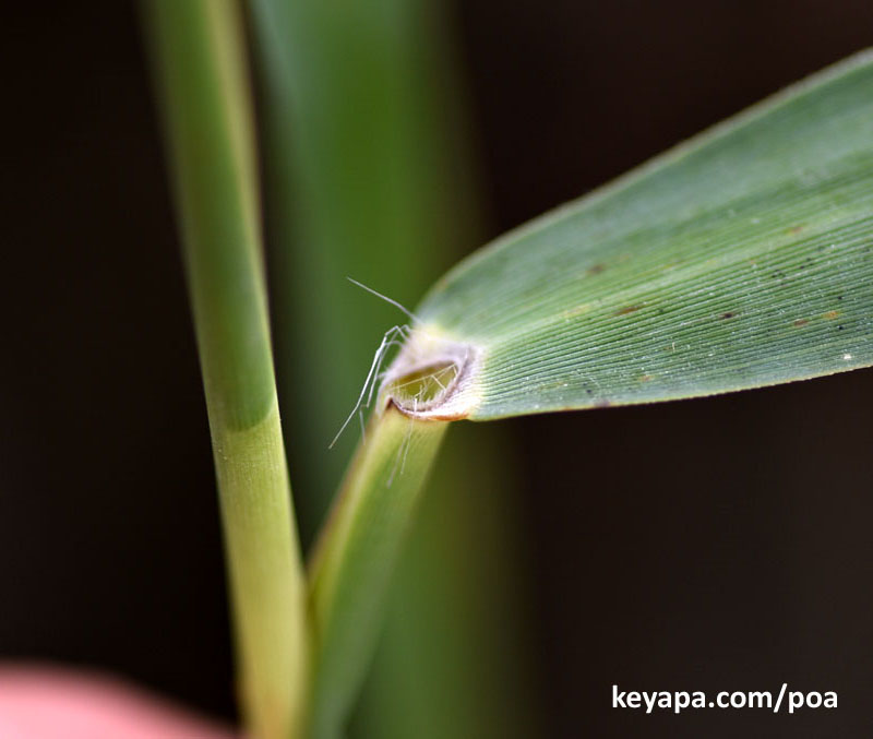 (4) The ligules (which are at the intersection of the top surface of leaf blades and the stem) look like brown lines. Height is less than 1 mm in the invasive form, and up to 2 mm in the native form. Long thread like hairs may be present as well.