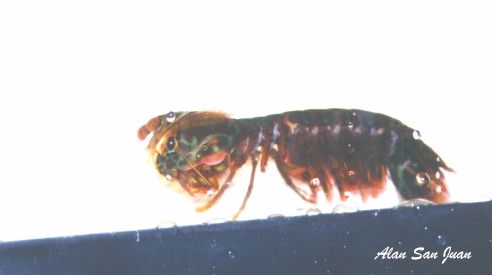 | Gonodactylaceus ternatensis by A Sunjian This specimen was sold as Odontodactylus scyllarus. It is a very colorful critter, with reddish hues spread all over its greenish body. You can clearly make out the red swellings of its raptorial appendages in the pic above (I am hoping to get a macro lens soon so I can take better images). This genus can be separated from the more familiar Gonodactylus because the dorsal (upper) surface of its telson (tailfin) has a "bump" with 5 distinct ridges decorating it. |