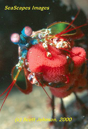 Another great picture of a mantis shrimp clutching its clump of eggs! Stomatopod eggs are stuck together using an adhesive secretion from special glands on the thorax of the female mantis. The egg mass is carried by the front thoracic appendages and constantly cleaned and turned. The female refrains from eating anything during the brooding process. For more information on stomatopod eggs click here. |