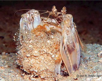 Trowbridge This particular individual, photographed near the Solomon Islands in 1995, looks decidedly grumpy as it excavates its burrow under the lights of 6-7 photographers. The mantis intermittently came out of its hole to toss out excess sand, the large compound eyes first scanning its surroundings before the rest of the body appeared. Thanks to Dr. Caldwell for identifying the specimen in this image, as well as the two other previously unidentified spearers. Note the very visible spines on the most distal segment (the dactyl) of the stomatopod's raptorial appendage. |